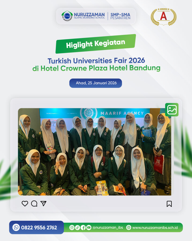 BANDUNG, 26 Januari 2026 – Sebagai wujud komitmen dalam mencetak generasi yang berdaya saing global, SMA Terpadu Nuruzzaman mengirimkan delegasi siswa kelas 11 dan 12 untuk menghadiri Turkish Universities Fair 2026. Kegiatan pameran pendidikan ini diselenggarakan oleh Edutolia Education di Grand Ballroom, Crowne Plaza Hotel Bandung, pada hari Minggu (25/01).